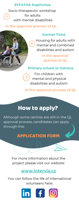 Pozor, pozor! Češka organizacija InterVIA u sklopu Europskih snaga solidarnosti traži volontere na 6 mjeseci, s početkom u veljači 2024. godine. Na sljedećim fotografijama možeš vidjeti opis aktivnosti